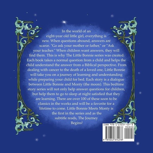 In the world of an eight-year old little girl, everything is new. When questions abound, answers are scarce. "Go ask your mother or father", or "Ask your teacher". When children want answers, they will find them. This is why The Little Bonnie series was created. Each book takes a normal question from a child and helps the child understand the answer from a Biblical perspective. From dealing with cancer to the death of a loved one, Little Bonnie will take you on a journey of learning and understanding while preparing your child for bed. Each story is a dialogue between Little Bonnie and Monty (the moon). This bedtime story series will not only help answer questions for children, but help them to go to sleep at night satisfied that they are learning. There are over 100 of these soon to be classics in the works and will be a favorite for a lifetime to come. Little Bonnie Meets Monty is the first in the series and as the sub-title reads, The Journey Begins!