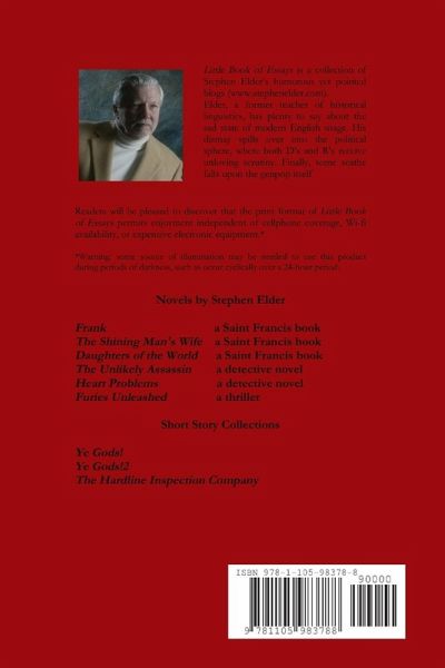 Newspaper columnist, author, blogger, cabinetmaker, home inspector, and Certified Old Guy Stephen Elder holds forth on a wide range of topics: education in America, worries about English, rants on Congress, why young women talk funny, myth correction, and string theory. Elder calls 'em as he sees 'em. Written under the influence (i.e. of Mark Twain and Dave Barry with an occasional dark detour into Ambrose Bierce), there is plenty of food for thought. Though his dry wit may be an acquired taste, it is also addictive. One critic has praised Elder's essays as "full of enlightened observations" about the past, the present, and the future. Another has maligned them as "suppurating with snarkiness, but sometimes justifiably so." The author recommends that you show initiative. Buy a copy and judge for yourself.