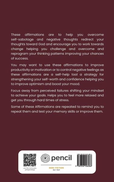These affirmations are to help you overcome self-sabotage and negative thoughts redirect your thoughts toward God and encourage you to work towards change helping you challenge and overcome and reprogram your thinking patterns improving your chances of success. You may want to use these affirmations to improve productivity or motivation or to control negative feelings as these affirmations are a self-help tool a strategy for strengthening your self-worth and confidence helping you to improve optimism and boost your mood. Focus away from perceived failures shifting your mindset to achieve your goals. Helps you to feel more relaxed and get you through hard times of stress. Some of these Affirmations are repeated to remind you to repeat them and test your memory skills or improve them.