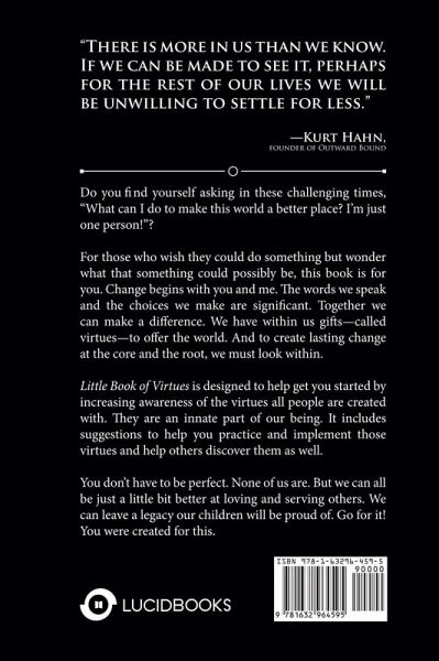 Do you find yourself asking these challenging times, "What can I do to make this world a better place? I'm just one person!"? For those who wish they could do something but wonder what that something could possibly be, this book is for you. Change begins with you and me. The words we speak and the choices we make are significant. Together we can make a difference. We have within us gifts-called virtues-to offer the world. And to create lasting change at the core and the root, we must look within. Little Book of Virtues is designed to help get you started by increasing awareness of the virtues all people are created with. They are an innate part of our being. It includes suggestions to help you practice and implement those virtues and help others discover them as well. You don't have to be perfect. None of us are. But we can all be just a little bit better at loving and serving others. We can leave a legacy our children will be proud of. Go for it! You were created for this.