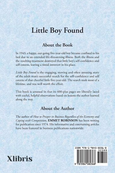 In 1943, a happy, out-going five-year-old boy became confined to his bed due to an extended life-threatening illness. Both the illness and the resulting treatment destroyed that little boy's self-confidence and self-esteem, leaving a timid introvert in his place. Little Boy Found is the engaging, moving and often amusing story of the adult man's successful search for the self-confidence and self esteem of that cheerful little five-year-old. The search took most of a lifetime, and was well worth the effort. This book is unusual in that its 400-plus pages are liberally laced with useful, helpful observations based on lessons the author learned along the way.