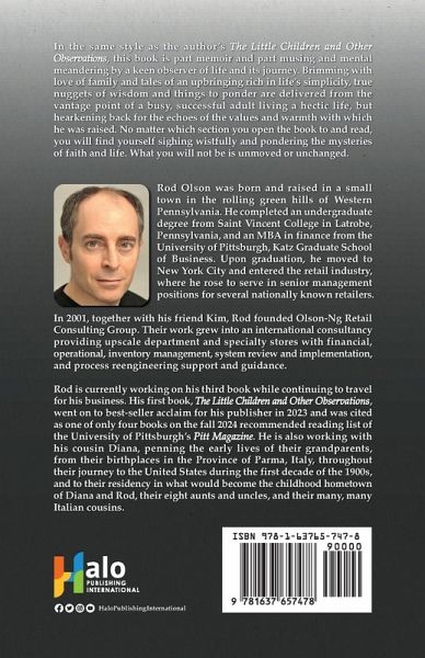 Rod Olson was born and raised in a small town in the rolling green hills of Western Pennsylvania. He completed an undergraduate degree from Saint Vincent College in Latrobe, Pennsylvania, and an MBA in finance from the University of Pittsburgh, Katz Graduate School of Business. Upon graduation, he moved to New York City and entered the retail industry, where he rose to serve in senior management positions for several nationally known retailers.In 2001, together with his friend Kim, Rod founded Olson-Ng Retail Consulting Group. Their work grew into an international consultancy providing upscale department and specialty stores with financial, operational, inventory management, system review and implementation, and process reengineering support and guidance.Rod is currently working on his third book while continuing to travel for his business. His first book, The Little Children and Other Observations, went on to best-seller acclaim for his publisher in 2023 and was cited as one of only four books on the fall 2024 recommended reading list of the University of Pittsburgh's Pitt Magazine. He is also working with his cousin Diana, penning the early lives of their grandparents, from their birthplaces in the Province of Parma, Italy, throughout their journey to the United States during the first decade of the 1900s, and to their residency in what would become the childhood hometown of Diana and Rod, their eight aunts and uncles, and their many, many Italian cousins.