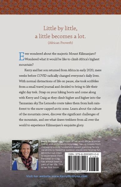 Ever wondered about the majestic Mount Kilimanjaro? Wondered what it would be like to climb Africa's highest mountain? Kerry and her son returned from Africa in early 2020, mere weeks before COVID radically changed everyone's daily lives. Kerry stopped her usual activities - working at her part-time job, seeing friends, doing laps at the local pool.... Because these routine distractions were unavailable, it was an opportunity for her to take scraps of notes about their trek and begin writing. Kerry took her small travel journal and decided to bring to life their eight day trek. What was it really like each day as they made their way to the summit? What did they encounter during the day and what was it like in camp each night? What was it like as they made the final push to the top? Strap on your hiking boots and come along with Kerry and Craig on their outdoor adventure as they climb higher and higher into the Tanzanian sky. The Lemosho route takes them from lush rainforest to the snow-capped arctic zone. Learn about the culture of the mountain crews, discover the significant challenges of the mountain, and see what draws trekkers from all over the world to experience Kilimanjaro's exquisite glory.