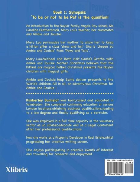 Book 1: Synopsis: 'To be or not to be Pet is the question! An introduction to the Naylor family, Angels Day school, Ms Caroline Featherbrook, Mary Lou's teacher, her classmates and Ambie and Joulsie. Mary Lou persuades her mother to allow her to keep a kitten after a class 'show and tell'. She is 'chosen' by Ambie and Joulsie' from 'Paws and Tails'. Mary Lou,Michael and Beth visit Sant's Grotto, with Ambie and Joulsie. Mother Christmas believes that the kittens are magical. Father Christmas presents the Naylor children with magical gifts. Ambie and Joulsie help Santa deliver presents to the World's children. All in all, an adventurous Christmas for Ambie and Joulsie !