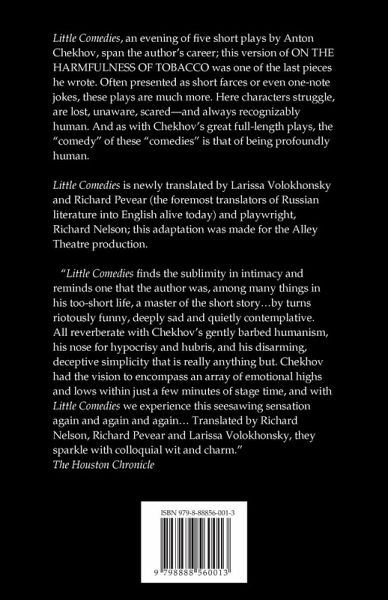 LITTLE COMEDIES, an evening of five short plays by Anton Chekhov, span the author's career; this version of ON THE HARMFULNESS OF TOBACCO was one of the last pieces he wrote. Often presented as short farces or even one-note jokes, these plays are much more. Here characters struggle, are lost, unaware, scared ¿-¿ and always recognizably human. And as with Chekhov's great full-length plays, the "comedy" of these "comedies" is that of being profoundly human. LITTLE COMEDIES is newly translated by Larissa Volokhonsky and Richard Pevear (the foremost translators of Russian literature into English alive today) and playwright Richard Nelson.