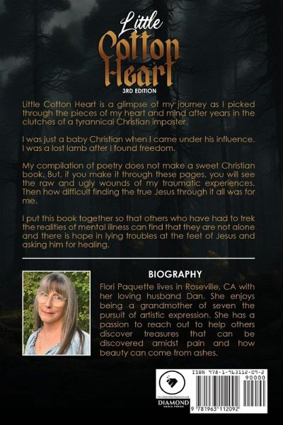 Little Cotton Heart is a glimpse of my journey as I picked through the pieces of my heart and mind after years in the clutches of a tyrannical Christian imposter. I was just a baby Christian when I came under his influence. I was a lost lamb after I found freedom. My compilation of poetry does not make a sweet Christian book. But, if you make it through these pages, you will see the raw and ugly wounds of my traumatic experiences. Then how difficult finding the true Jesus through it all was for me. I put this book together so that others who have had to trek the realities of mental illness can find that they are not alone and there is hope in lying troubles at the feet of Jesus and asking him for healing