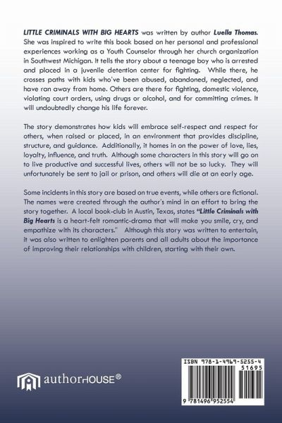 " LITTLE CRIMINALS WITH BIG HEARTS was written by author Luella Thomas. She was inspired to write this book based on her personal and professional experiences working as a Youth Counselor through her church organization in Southwest Michigan. It tells the story about a teenage boy who is arrested and placed in a juvenile detention center for fighting. While there, he crosses paths with kids whöve been abused, abandoned, neglected, and have ran away from home. Others are there for fighting, domestic violence, violating court orders, using drugs or alcohol, and for committing crimes. It will undoubtedly change his life forever. The story demonstrates how kids will embrace self-respect and respect for others, when raised or placed, in an environment that provides discipline, structure, and guidance. Additionally, it homes in on the power of love, lies, loyalty, influence, and truth. Although some characters in this story will go on to live productive and successful lives, others will not be so lucky. They will unfortunately be sent to jail or prison, and others will die at an early age. Some incidents in this story are based on true events, while others are fictional. The names were created through the author¿s mind in an effort to bring the story together. A local book-club in Austin, Texas, states ¿Little Criminals with Big Hearts is a heart-felt romantic-drama that will make you smile, cry, and empathize with its characters.¿ Although this story was written to entertain, it was also written to enlighten parents and all adults about the importance of improving their relationships with children, starting with their own."