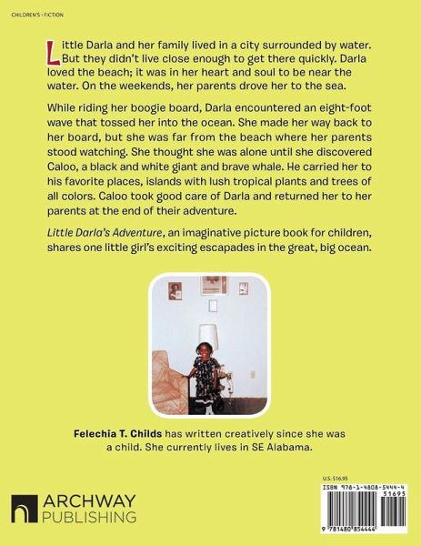 Little Darla and her family lived in a city surrounded by water. But they didn?t live close enough to get there quickly. Darla loved the beach; it was in her heart and soul to be near the water. On the weekends, her parents drove her to the sea. While riding her boogie board, Darla encountered an eight-foot wave that tossed her into the ocean. She made her way back to her board, but she was far from the beach where her parents stood watching. She thought she was alone until she discovered Caloo, a black and white giant and brave whale. He carried her to his favorite places, islands with lush tropical plants and trees of all colors. Caloo took good care of Darla and returned her to her parents at the end of their adventure. Little Darla?s Adventure, an imaginative picture book for children, shares one little girl?s exciting escapades in the great, big ocean.