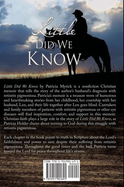 Little Did We Know by Patricia Holder is a nonfiction Christian memoir that tells the story of the author's husband's diagnosis with retinitis pigmentosa. Patricia's memoir is a treasure trove of humorous and heartbreaking stories from her childhood, her courtship with her husband, Len, and their life together after Len goes blind. Caretakers and family members of patients with retinitis pigmentosa or other eye diseases will find inspiration, comfort, and support in this memoir. Christian faith plays a large role in the story of Little Did We Know, as Patricia Holder shares about turning to God during this struggle with retinitis pigmentosa. Each chapter in the book points to truth in Scripture about the Lord's faithfulness and power to save despite their suffering from retinitis pigmentosa. Throughout the good times and the bad, Patricia turns toward the Lord for peace throughout life's storms.