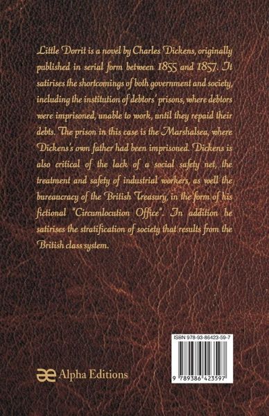 Little Dorrit is a novel by Charles Dickens, originally published in serial form between 1855 and 1857. It satirises the shortcomings of both government and society, including the institution of debtors' prisons, where debtors were imprisoned, unable to work, until they repaid their debts. The prison in this case is the Marshalsea, where Dickens's own father had been imprisoned. Dickens is also critical of the lack of a social safety net, the treatment and safety of industrial workers, as well the bureaucracy of the British Treasury, in the form of his fictional "Circumlocution Office". In…mehr
