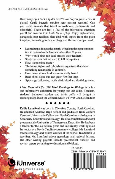 How many eyes does a spider have? How do you grow seedless plants? Could bacteria survive near nuclear reactors? Can you name animals that travel in coalitions, parliaments and mischiefs? These are just a few of the interesting questions you'll find answers to in Little Facts of Life. Enjoy high-interest, paragraph-long readings that deal with topics from the plant kingdom, animals, genetics, ecology and the microscopic world. ¿ Learn about a fungus that nearly wiped out the most common tree in eastern North America in less than 50 years. ¿ Why would birds rub dead ants on their feathers? ¿ Study bacteria that are used to kill mosquitoes. ¿ How is chocolate made? ¿ The hinny, tiglon and cabbish are organisms that share something remarkable in common. ¿ How many stomachs does a cow really have? ¿ Read about algae that can grow 700 feet long. ¿ Spiders go ballooning, moths drink blood and devil dogs swim. Little Facts of Life: 350 Mini Readings in Biology is a fun and informative collection for young and old alike. Teachers, students, bathroom readers and trivia buffs will delight in learning more about the world in which we live! Good, clean fun!