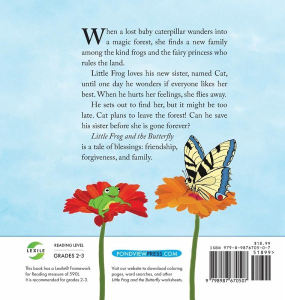 Ever feel like your sister gets all the attention? Little Frog does. He knows his new sister is special. What really bugs him is that everyone else knows it, too! To make it even worse, one day his tiny sister sprouts wings and turns into a butterfly. He hurts her feelings so badly that she flies away from home and lands herself in danger. As he races to save her, he learns it's okay to admit that he's done wrong because that's how we begin to do better. He also learns how to appreciate the good and beautiful qualities in others without feeling bad about himself. Little Frog and the Butterfly is a 32-page fairy tale with lots of pictures. It is geared to grades 2-3 and is meant to help kids bridge the gap between picture books and chapter books.
