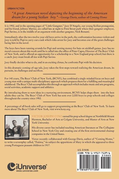 It is 1952, and in the opening pages of "Little Gangster," Joey D'Angelo our young Sicilian protagonist and his friend, Johnny Marino, are called late at night to First Street park where their gangster employer, Pepi Savino, is in the middle of an argument with another gangster, Nick Bonanti. Immediately after the two twelve year old boys arrive in the park, the confrontation becomes violent, and Joey is told to perform a task which becomes one of many challenges facing him throughout the novel and places him as an accomplice to a crime in danger of being arrested. Joey and Johnny have been running errands for Pepi and earning enough money to gamble on their Saturday afternoon stickball games. Joey has no moral concern about this work until he is called to the office of Peter Capra, Director of the Boys' Club of New York, and is offered an opportunity for a scholarship to a New England prep school, but there is a catch: Joey must give up all ties to Pepi. Joey faces other challenges: he must leave his Lower East Side neighborhood, his family and friends, and his girl, Maria. Throughout the novel, he faces problems which force him to question his amoral behavior. Thus begins for him an understanding of what it means to be a responsible young man. Johnny advises Joey not to take the scholarship while his Jewish friend, Harold Tapper, thinks he is crazy if he does not if offered. Joey finally decides what to do, and in an exciting climax, he confronts Pepi with his decision. In this dramatic and exciting coming-of-age tale, Joey takes the first steps toward realizing the American dream, its pursuits, its challenges, struggles and sacrifices.