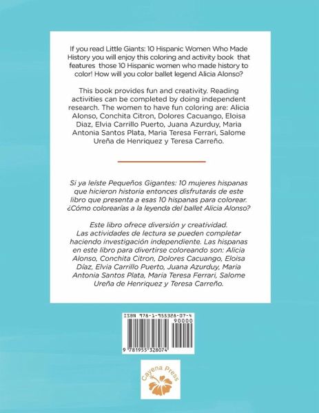 If you read Little Giants: 10 Hispanic Women Who Made History, you will enjoy this coloring and activity book that features those 10 Hispanic women who made history to color! How will you color ballet legend, Alicia Alonso? This book provides fun and creativity. Reading activities can be completed by doing independent research. ¿The women for you to have fun coloring are: Alicia Alonso, Conchita Citron, Dolores Cacuango, Eloisa Diaz, Elvia Carrillo Puerto, Juana Azurduy, Maria Antonia Santos Plata, Maria Teresa Ferrari, Salome Ureña de Henriquez y Teresa Carreño.