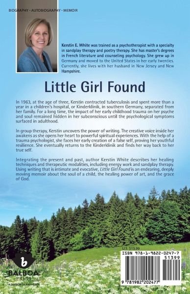 In 1963, at the age of three, Kerstin contracted tuberculosis and spent more than a year in a childrens hospital, or Kinderklinik, in southern Germany, separated from her family. For a long time, the impact of her early childhood trauma on her psyche and soul remained hidden in her subconscious until the psychological symptoms surfaced in adulthood. In group therapy, Kerstin uncovers the power of writing. The creative voice inside her awakens as she opens her heart to powerful spiritual experiences. With the help of a trauma psychologist, she faces her early creation of a false self, proving her youthful resilience. She eventually returns to the Kinderklinik and finds her way back to her true self. Integrating the present and past, author Kerstin White describes her healing techniques and therapeutic modalities, including energy work and sandplay therapy. Using writing that is intimate and evocative, Little Girl Found is an endearing, deeply moving memoir about the soul of a child, the healing power of art, and the grace of God.