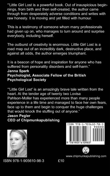 by Lovisa Pahlson-Moller Published: 2006 Pages: 200 Description Little Girl Lost is a wonderful and moving account of a young woman's successful battle with self-harm and borderline personality disorder. Lovisa first self-harmed at the age of six and survived boot camp before becoming part of the psychiatric system. Little Girl Lost combines an intelligent creative mix of diary writing with powerful poems taking the reader through a roller coaster of emotions. It is an honest, interesting and touching book. She gives us some insight into her desire for acceptance for being herself. You can relate to her feelings. About the Author The author spent a period of time in hospital. She used to harm herself and hear voices. Her aim is to reach out to others and be accepted. Book Extract Ever felt sad and been so down, that to carry a smile is impossible? Has time ever stopped without a reasonable explanation? Where a few hours could have passed, or even a day, and there is no memory of how you spent that time of blackness? Is your best friend or dearest enemy a disfigured shadow? Something your mind has created, and others cannot see or hear? Have you ever placed your life in a bottle of pills? Can you not tell the difference from a dream or reality? Do your emotions reflect from the blade of a knife? Have you ever felt sadness in others joy, or joy in your own pain? Ever not feared death, but life itself? I have.this is my life.welcome to my world.