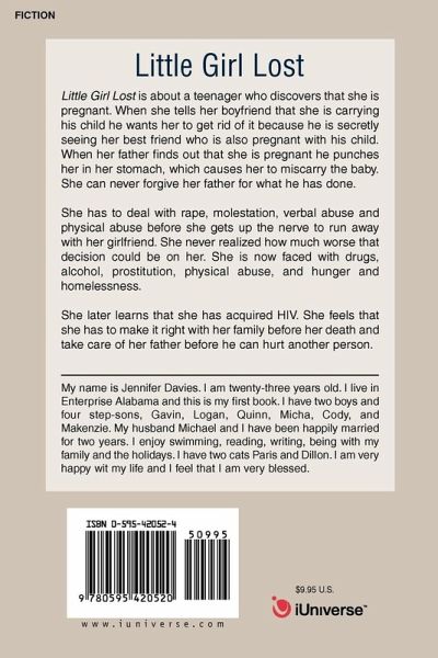 Little Girl Lost is about a teenager who discovers that she is pregnant. When she tells her boyfriend that she is carrying his child he wants her to get rid of it because he is secretly seeing her best friend who is also pregnant with his child. When her father finds out that she is pregnant he punches her in her stomach, which causes her to miscarry the baby. She can never forgive her father for what he has done. She has to deal with rape, molestation, verbal abuse and physical abuse before she gets up the nerve to run away with her girlfriend. She never realized how much worse that decision could be on her. She is now faced with drugs, alcohol, prostitution, physical abuse, and hunger and homelessness. She later learns that she has acquired HIV. She feels that she has to make it right with her family before her death and take care of her father before he can hurt another person.