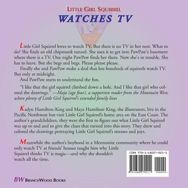 Michael A. King, Telford, Pennsylvania, grandfather of six, is author of books and articles; blogger and editor, Kingsview & Co; and publisher, Cascadia Publishing House LLC. He has been a pastor and seminary dean. Years ago he found in a basement panel the hole Little Girl Squirrel uses though it's possible a chimpmunk or her parents were also involved. His boyhood in a Mennonite community where he could only watch TV at friends' houses taught him why Little Squirrel thinks TV is magic-but also why she shouldn't watch all the time.
