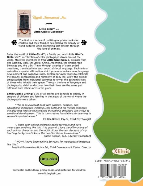 From the Little Gizzi's Galleries comes a wonderful multilingual, multicultural photography book perfect for preschool and school age children around the world! This original book introduces animal ambassadors from seven countries including The Gambia, Italy, Sri Lanka, China, Argentina, the United Arab Emirates and the USA. Every animal represents a special affirmation to promote self-esteem. Filled with open ended questions and over 60 authentic color photographs, this is a book you read WITH your children, not to your children. Travel the world with the Little Gizzi Group and celebrate the beauty of world cultures! Grab one now!