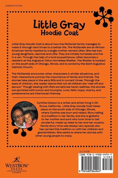 Little Gray Hoodie Coat is about how the McDaniel family manages to make it through hard times to a better life. The McDaniels are an African American family headed by a single mother named Lillian. She has two young daughters, Jasmine and Lillie. They are initially homeless and live in a van. Through the help of a kind acquaintance, Lillian becomes a resident at the Augustus Tolton Homeless Shelter. The Shelter is located on the south side of Chicago, Illinois, and is owned by the Saint Augustus Catholic Church. The McDaniels encounter other characters in similar situations, and their interactions portray the importance of family and friends. The stories take place in the early 90s and in current times. Through the eyes of children, the reader learns that not all children are "well off and secure." Though dealing with life's sometimes-harsh realities, the stories are sprinkled with humor and triumphs. Love, faith, hope, charity, and perseverance are interwoven themes.