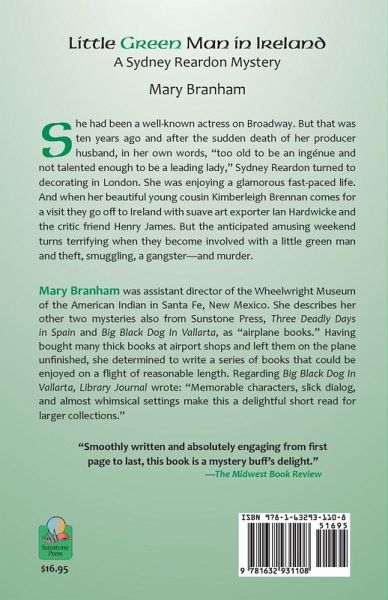 She had been a well-known actress on Broadway. But that was ten years ago and after the sudden death of her producer husband, in her own words, "too old to be an ingénue and not talented enough to be a leading lady," Sydney Reardon turned to decorating in London. She was enjoying a glamorous fast-paced life. And when her beautiful young cousin Kimberleigh Brennan comes for a visit they go off to Ireland with suave art exporter Ian Hardwicke and the critic friend Henry James. But the anticipated amusing weekend turns terrifying when they become involved with a little green man and theft, smuggling, a gangster-and murder. * * * * Mary Branham was assistant director of the Wheelwright Museum of the American Indian in Santa Fe, New Mexico. She describes her other two mysteries also from Sunstone Press, "Three Deadly Days in Spain" and "Big Black Dog In Vallarta," as "airplane books." Having bought many thick books at airport shops and left them on the plane unfinished, she determined to write a series of books that could be enjoyed on a flight of reasonable length. Regarding "Big Black Dog In Vallarta," "Library Journal" wrote: "Memorable characters, slick dialog, and almost whimsical settings make this a delightful short read for larger collections." "The Midwest Book Review" said the book was "Smoothly written and absolutely engaging from first page to last, a mystery buff's delight."