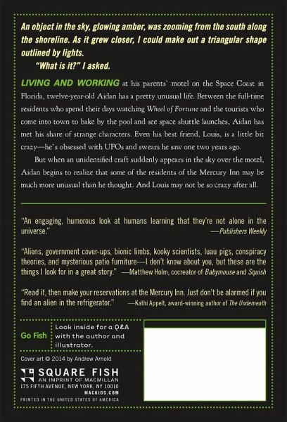 Beach culture and UFOs collide in this lighthearted adventure story about an alien encounter at an aging Cocoa Beach motel. Twelve-year-old Aidan lives and works at his parents' motel on the Space Coast in Florida, so he's seen a lot of weird stuff. Even his best friend, Louis, is a little bit crazy-he's obsessed with UFOs and swears he saw one two years ago. But things at the Mercury Inn are about to get a whole lot weirder. When an actual unidentified flying object suddenly appears in the sky over the motel, Aidan begins to realize that some of the residents of the Mercury Inn may be much more unusual than he thought. And Louis might not be so crazy after all. Filled with quirky characters and atmosphere, this beachy alien caper, like the aging motel where it takes place, is anything but ordinary.