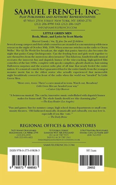 Musical ComedyCharacters: 4 males, 5 females, plus 2 males children, 2 female children"They come from several million miles away, But they are not on vacation, they are here to stay!"Several young campers and their adult counselors are stranded at a mountaintop wilderness retreat on the night of October 30th, 1938. When someone switches on the radio to Orson Welles' War Of The Worlds live broadcast, the night that panics America also becomes the night that panics Camp gitchiegoomie. Are little green men from Mars actually surrounding the mess hall, ready to make a mess of everyone inside? Can the feuding boys and girls work together to save themselves from the mysterious alien invasion? And why is that strange hairy, bug-eyed monster lurking in the bushes?This hilarious, family-friendly musical recreates the innocent fun and slapstick humor of the wise-cracking, high-spirited film comedies of the late 1930s, complete with spooky campfires, ghostly shadows, hair-raising Halloween surprises and the scariest radio play of all time that nearly fooled the entire nation. The lively, toe-tapping original songs are fondly reminiscent of the popular scores from the golden age of the Warner Brothers and MGM film musicals with plenty of high-kicking, energetic and imaginative choreography in the unforgettable styles of Busby Berkeley, Fred Astaire and Gene Kelly.This happiest-of-Halloween musical comedies is guaranteed fun for the entire family, from the youngest monster movie fan to the oldest senior who actually experienced that memorable night breathlessly cowered in front of the radio when the world was "invaded" by Little Green Men."Move over Annie.' There's a new musical in town. Watch out, Broadway. Little Green Men are headed your way." -Culver City Observer"A boisterous musical. The catchy, innovative music embellished with slapstick humor makes for funny stuff. The whole family should see this charming play." -The Los Angeles Easy Reader"Fine for summer camps, high school drama departments or small community theatres. You may love it, especially if you like 'cute'." -The Daily Breeze "There's plenty of tricks and treats in store for everyone on a Halloween eve that no one will ever forget. It is one of those musical gems that is funny, delectable, a bit silly, and best of all, very family friendly. It's safe to know that musicals such as this one still exist within the theatre world." -Linear Cycle Prods/Accessibility Live