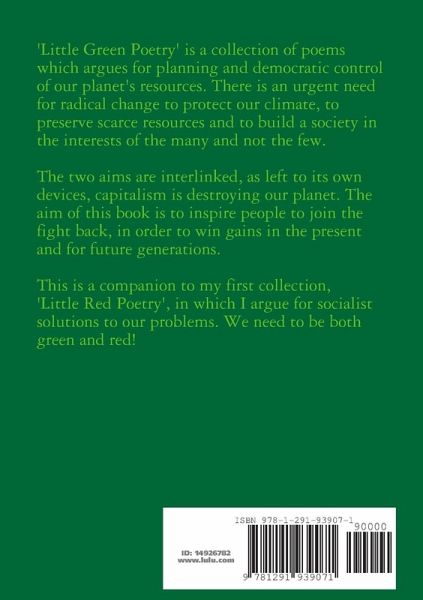 This collection of poems - some playful, others serious - is intended to highlight the destruction of our environment at the hands of capitalism. I have also put forward the alternative, a society where wealth is shared, rather than hoarded, and used for the common good. A planet where the vast majority of its citizens - the 99%% - are in control, not a tiny elite, to allow us to plan our economy to solve environmental threats.