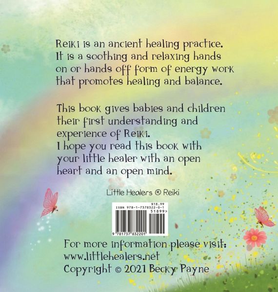 Reiki is an ancient healing practice. It is a soothing and relaxing hands on or hands off form of energy work that promotes healing and balance. This book gives babies and children their first understanding and experience of Reiki. This book will teach children how to begin to heal themselves by placing their own hands on their body and sending themselves healing, reiki energy. I hope you read this book with your little healer with an open heart and an open mind. For more information please visit: www.littlehealers.net
