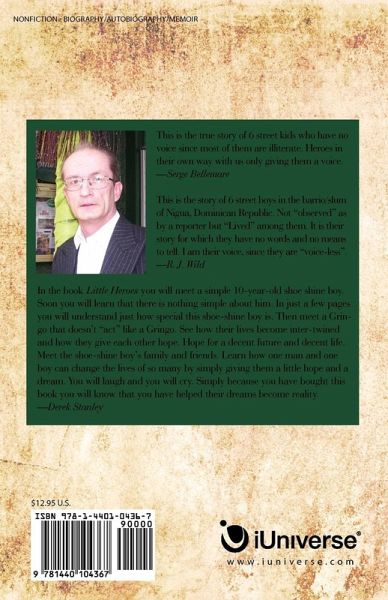 This is the true story of 6 street kids who have no voice since most of them are illiterate. Heroes in their own way with us only giving them a voice... Serge Bellemare This is the story of 6 street boys in the barrio/slum of Nigua, Dominican Republic. Not "observed" as by a reporter but "Lived" among them. It is their story for which they have no words and no means to tell. I am their voice, since they are "voice-less". R. J. Wild In the book "Little Heroes" you will meet a simple 10-year-old shoe shine boy. Soon you will learn that there is nothing simple about him. In just a few pages you will understand just how special this shoe-shine boy is. Then meet a Gringo that doesn't "act" like a Gringo. See how their lives become inter-twined and how they give each other hope. Hope for a decent future and decent life. Meet the shoe-shine boy's family and friends. Learn how one man and one boy can change the lives of so many by simply giving them a little hope and a dream. You will laugh and you will cry. Simply because you have bought this book you will know that you have helped their dreams become reality. Derek Stanley