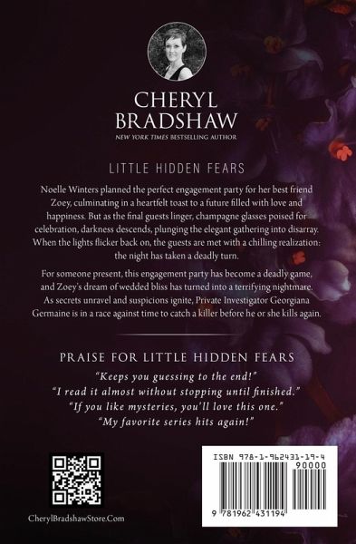 Noelle Winters planned the perfect engagement party for her best friend Zoey, culminating in a heartfelt toast to a future filled with love and happiness. But as the final guests linger, champagne glasses poised for celebration, darkness descends, plunging the elegant gathering into disarray. When the lights flicker back on, the guests are met with a chilling realization: the night has taken a deadly turn. For someone present, this engagement party has become a deadly game, and Zoey's dream of wedded bliss has turned into a terrifying nightmare. As secrets unravel and suspicions ignite, Private Investigator Georgiana Germaine is in a race against time to catch a killer before he or she kills again. What Readers are Saying about the Series: "Makes you want to keep reading the story into the night." ¿¿¿¿¿¿¿¿¿¿ "A strong lead character and plenty of drama, it keeps the reader engaged." ¿¿¿¿¿¿¿¿¿¿ "Leaving you wanting to read more." ¿¿¿¿¿¿¿¿¿¿ "I will definitely read more from this author." ¿¿¿¿¿¿¿¿¿¿ "Kept me on the edge of my seat." ¿¿¿¿¿¿¿¿¿¿