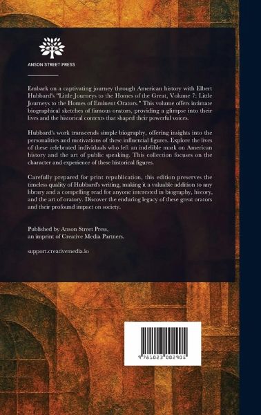 Embark on a captivating journey through American history with Elbert Hubbard's "Little Journeys to the Homes of the Great, Volume 7: Little Journeys to the Homes of Eminent Orators." This volume offers intimate biographical sketches of famous orators, providing a glimpse into their lives and the historical contexts that shaped their powerful voices. Hubbard's work transcends simple biography, offering insights into the personalities and motivations of these influential figures. Explore the lives of these celebrated individuals who left an indelible mark on American history and the art of public speaking. This collection focuses on the character and experience of these historical figures. Carefully prepared for print republication, this edition preserves the timeless quality of Hubbard's writing, making it a valuable addition to any library and a compelling read for anyone interested in biography, history, and the art of oratory. Discover the enduring legacy of these great orators and their profound impact on society. This work has been selected by scholars as being culturally important, and is part of the knowledge base of civilization as we know it. This work is in the public domain in the United States of America, and possibly other nations. Within the United States, you may freely copy and distribute this work, as no entity (individual or corporate) has a copyright on the body of the work. Scholars believe, and we concur, that this work is important enough to be preserved, reproduced, and made generally available to the public. We appreciate your support of the preservation process, and thank you for being an important part of keeping this knowledge alive and relevant.