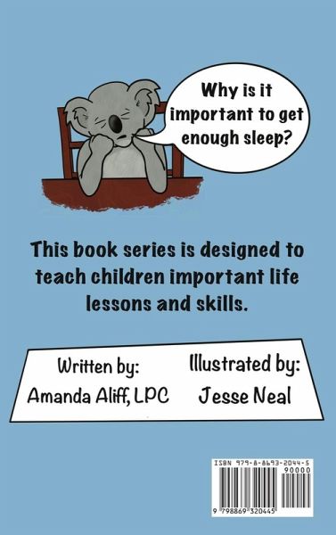The importance of sleep is the topic addressed within this book. What happens when Little Koala decides to do other activities instead of go to bed on time? What will Little Koala learn about the importance of sleep during his adventures? THIS BOOK IS PART OF THE LITTLE KOALA LIFE SKILLS SERIES. This book series is designed to teach children important skills. Each book in the series has a different theme related to life skills. A separate section in the back provides important topics covered through the book in addition to follow up questions for families to ask their children. These questions are meant to create open communication and further conversation regarding important life lessons. This book series is recommended for children between the ages of four through nine, but could be used for children of all ages.