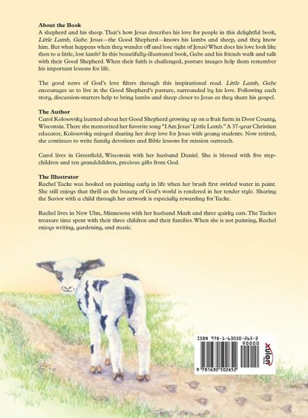 About the Book A shepherd and his sheep. That's how Jesus describes his love for people in this delightful book, Little Lamb, Gabe. Jesus--the Good Shepherd--knows his lambs and sheep, and they know him. But what happens when they wander off and lose sight of Jesus? What does his love look like then to a little, lost lamb? In this beautifully-illustrated book, Gabe and his friends walk and talk with their Good Shepherd. When their faith is challenged, pasture images help them remember his important lessons for life. The good news of God's love filters through this inspirational read. Little Lamb, Gabe encourages us to live in the Good Shepherd's pasture, surrounded by his love. Following each story, discussion-starters help to bring lambs and sheep closer to Jesus as they share his gospel. The Author Carol Kolosovsky learned about her Good Shepherd growing up on a fruit farm in Door County, Wisconsin. There she memorized her favorite song "I Am Jesus' Little Lamb." A 37-year Christian educator, Kolosovsky enjoyed sharing her deep love for Jesus with young students. Now retired, she continues to write family devotions and Bible lessons for mission outreach. Carol lives in Greenfield, Wisconsin with her husband Daniel. She is blessed with five step-children and nine grandchildren. The Illustrator Rachel Tacke was hooked on painting early in life when her brush first swirled water in paint. She still enjoys that thrill as the beauty of God's world is rendered in her tender style. Sharing the Savior with a child through her artwork is especially rewarding for Tacke. Rachel lives in New Ulm, Minnesota with her husband Mark and three quirky cats. The Tackes treasure time spent with their three children and four grandchildren. When she is not painting, Rachel enjoys writing, gardening, and music.