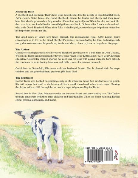 About the Book A shepherd and his sheep. That’s how Jesus describes his love for people in this delightful book, Little Lamb, Gabe. Jesus—the Good Shepherd—knows his lambs and sheep, and they know him. But what happens when they wander off and lose sight of Jesus? What does his love look like then to a little, lost lamb? In this beautifully-illustrated book, Gabe and his friends walk and talk with their Good Shepherd. When their faith is challenged, pasture images help them remember his important lessons for life. The good news of God’s love filters through this inspirational read. Little Lamb, Gabe encourages us to live in the Good Shepherd’s pasture, surrounded by his love. Following each story, discussion-starters help to bring lambs and sheep closer to Jesus as they share his gospel. The Author Carol Kolosovsky learned about her Good Shepherd growing up on a fruit farm in Door County, Wisconsin. There she memorized her favorite song “I Am Jesus’ Little Lamb.” A 37-year Christian educator, Kolosovsky enjoyed sharing her deep love for Jesus with young students. Now retired, she continues to write family devotions and Bible lessons for mission outreach. Carol lives in Greenfield, Wisconsin with her husband Daniel. She is blessed with five step-children and nine grandchildren. The Illustrator Rachel Tacke was hooked on painting early in life when her brush first swirled water in paint. She still enjoys that thrill as the beauty of God’s world is rendered in her tender style. Sharing the Savior with a child through her artwork is especially rewarding for Tacke. Rachel lives in New Ulm, Minnesota with her husband Mark and three quirky cats. The Tackes treasure time spent with their three children and four grandchildren. When she is not painting, Rachel enjoys writing, gardening, and music.