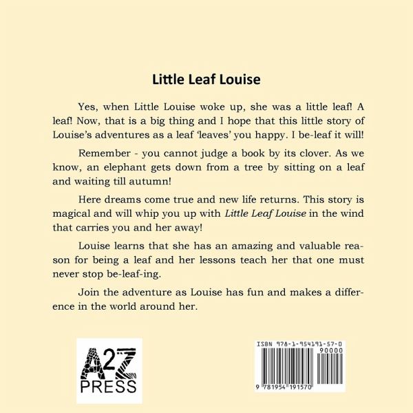 A charming little 32 paee children's book about a little girl who turns into a leaf one night and as she floats around, she finds a tree in need, helps, meets a friend, and then returns to hr own bed to try to remember if it was all very real or just a dream she had. Join Louise in her light-hearted journey.