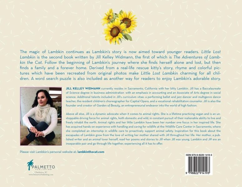 JILL KELLEY WIDMANN currently resides in Sacramento, California with her kitty Lambkin. Jill has a Baccalaureate of Science degree in business administration with an emphasis in accounting and an Associate of Arts degree in social science. Additional talents included in Jill's curriculum vitae: a performing ballet and jazz dancer and multigenre dance teacher for most of her life, the resident children's choreographer for Capital Opera, and a vocational rehabilitation counselor. Jill is also the founder and creator of Garden of Beauty, an entrepreneurial endeavor into the world of high fashion. Above all else, Jill is a dynamic advocate when it comes to animal rights. She is a lifetime practicing vegan and is an unstoppable driving force for animal rights, both domestic and wild, in constant pursuit of their inalienable ability to live and freely inhabit the earth. Animal rights and her little Lambkin have been her number-one focus in her inspired life. She has acquired hands-on experience with handling and caring for wildlife at the Wildlife Care Center in Sacramento, where she completed an internship in wildlife care to proactively support animal safety. Inspiration for this book about the escapades of Lambkin grew from the love of writing her mother shared with Jill throughout her life. Her mother, a published writer and an animal lover herself, read her poems and stories to Jill when Jill was young. Lambkin and Jill are an inseparable pair and go through life together, experiencing all it has to offer. Please visit Lambkin's personal website at: lambkinthecat.com