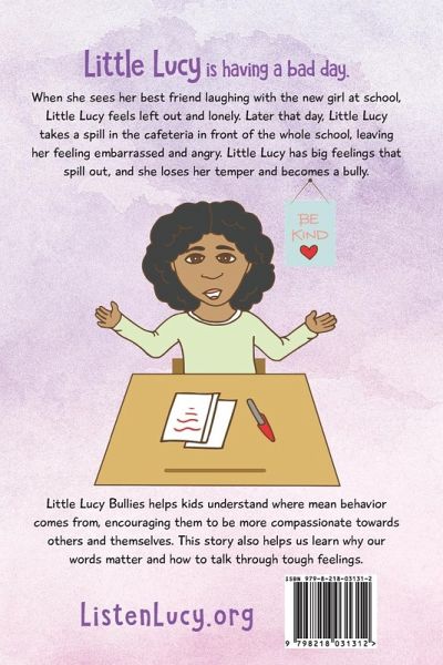 Little Lucy is having a bad day. When she sees her best friend laughing with the new girl at school, Little Lucy feels left out and lonely. Later that day, Little Lucy takes a spill in the cafeteria in front of the whole school, leaving her feeling embarrassed and angry. Little Lucy has big feelings that spill out, and she loses her temper and becomes a bully. Little Lucy Bullies helps kids understand where mean behavior comes from, encouraging them to be more compassionate towards others and themselves. This story also helps us learn why our words matter and how to talk through tough feelings.
