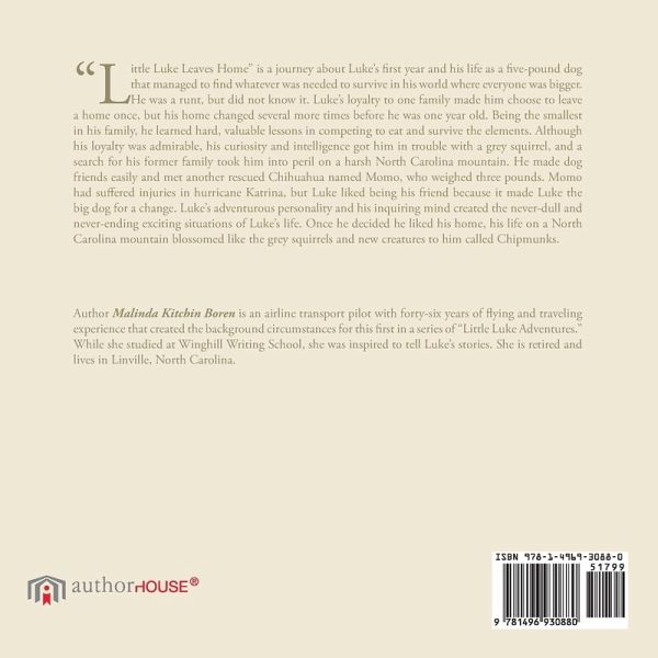 "Little Luke Leaves Home" is a journey about Luke's first year and his life as a five-pound dog that managed to find whatever was needed to survive in his world where everyone was bigger. He was a runt, but did not know it. Luke's loyalty to one family made him choose to leave a home once, but his home changed several more times before he was one year old. Being the smallest in his family, he learned hard, valuable lessons in competing to eat and survive the elements. Although his loyalty was admirable, his curiosity and intelligence got him in trouble with a grey squirrel, and a search for his former family took him into peril on a harsh North Carolina mountain. He made dog friends easily and met another rescued Chihuahua named Momo, who weighed three pounds. Momo had suffered injuries in hurricane Katrina, but Luke liked being his friend because it made Luke the big dog for a change. Luke's adventurous personality and his inquiring mind created the never-dull and never-ending exciting situations of Luke's life. Once he decided he liked his home, his life on a North Carolina mountain blossomed like the grey squirrels and new creatures to him called Chipmunks.