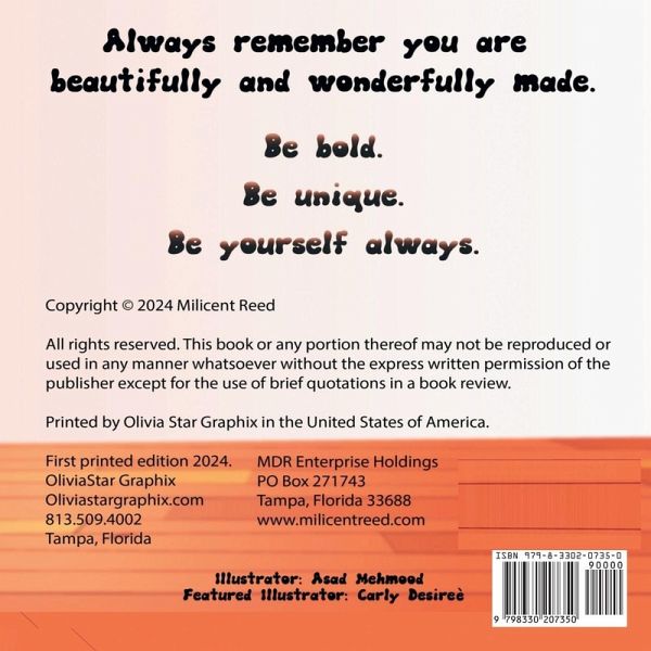 Milicent Reed, 41, hails from Orlando, Florida, where she was raised with humble beginnings. Her childhood love for the Berenstain Bears sparked a lifelong dream to write children's books. Known as the fun Auntie to her nieces, nephews, and friends' kids, Milicent has always been passionate about bringing joy and laughter to young hearts.Outside of writing, Milicent enjoys the beach, traveling, and embracing the simple joys of life. As a Fortune 25 HR leader, she is dedicated to eliminating the socioeconomic gap by empowering and educating the youth on the importance of confidence and self-love. Through her books, Milicent aims to inspire children to believe in themselves and embrace their unique qualities.