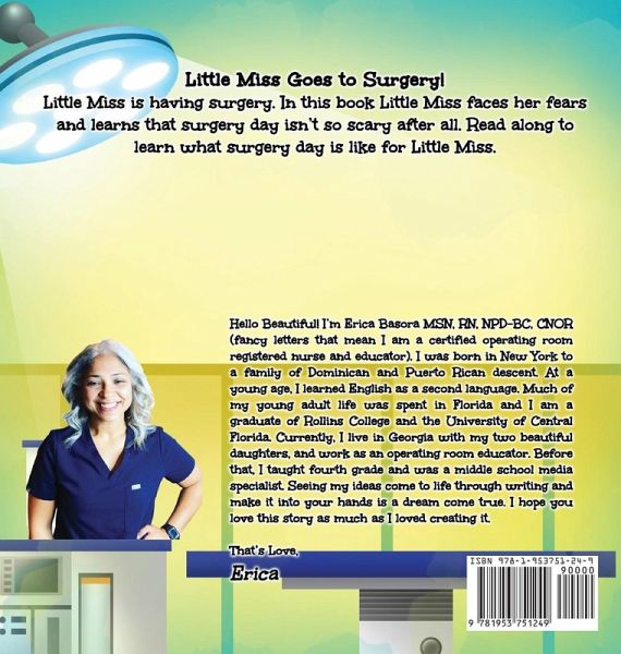 Looking for a way to ease your child's fears before surgery? Look no further than Little Miss Goes to Surgery. Surgery is a scary word for kids and parents alike. It's natural for kids to feel scared about surgery. They may not understand what's happening or why they have to go through it. "Little Miss Goes to Surgery" is the perfect book to help ease your child's fears before surgery. Written with love and warmth, this charming tale follows Little Miss as she prepares for her operation. With the help of her mom, kind doctors and nurses, and surgical team, she soon discovers the courage she needs to face surgery with a smile. Filled with encouragement, this ideal book for parents to read to their children before surgery is sure to bring comfort and smiles to everyone involved. Filled with encouragement, this ideal book for parents to read to their children before surgery is sure to bring comfort and smiles to every child who reads it. This book will: ¿EASE YOUR CHILD'S FEARS BEFORE SURGERY - Looking for a way to ease your child's fears before surgery? Look no further than Little Miss Goes to Surgery. Written with humor and warmth, this charming tale follows Little Miss as she prepares for her operation. Filled with encouragement, this ideal book for parents to read to their children before surgery is sure to bring comfort and smiles to everyone. ¿A WARM AND HUMOROUS TALE OF COURAGE - Follow Little Miss as she prepares for her operation with the help of her parents, kind doctors ¿THE PERFECT BOOK FOR PARENTS TO READ TO THEIR CHILDREN BEFORE SURGERY - Little Miss Goes to Surgery is filled with encouragement and is the ideal book for parents to read to their children before surgery. ¿A GREAT RESOURCE FOR CHILDREN'S HOSPITALS - This charming book is a great resource for children's hospitals and surgical centers. ¿WRITTEN BY AN OPERATING ROOM NURSE - :Little Miss Goes to Surgery" was written by an operating room nurse with the goal of helping children and their families prepare for surgery. Her experience as a circulator, and mom combined with her warmth and love, makes this book a must-read for anyone facing surgery. Looking for a way to ease your child's fears before surgery? Look no further than Little Miss Goes to Surgery.