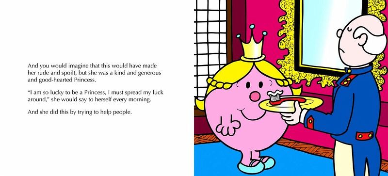 Little Miss Princess lives in a castle with turrets and a moat, and she has lots of people to do things for her. But Little Miss Princess isn't rude or spoilt. One day, she decides to help an injured Mr. Bump, but as you can imagine, Little Miss Princess isn't used to doing things herself, so everything doesn't quite go to plan...