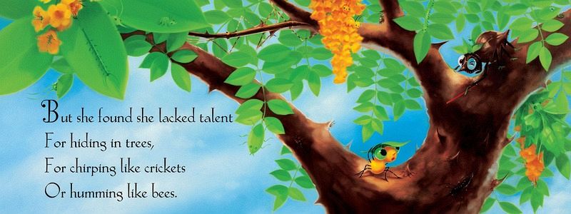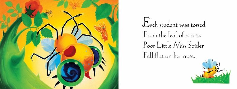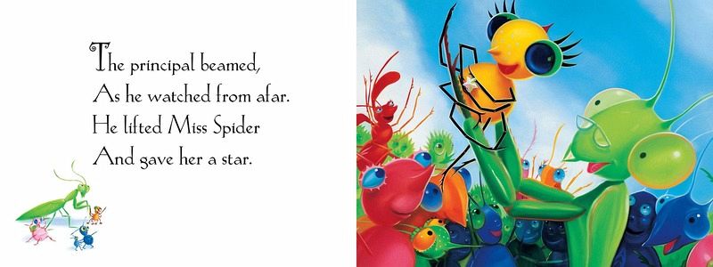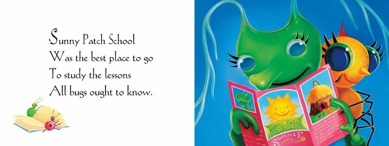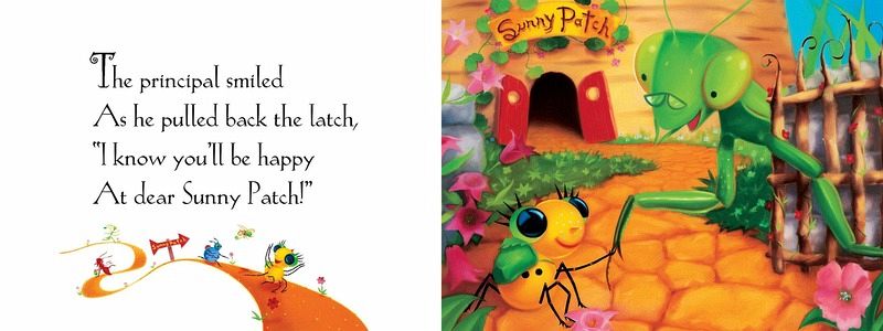 Sunny Patch School Was the best place to go to study the lessons all bugs ought to know. When the first day of school arrives, Little Miss Spider is almost beside herself with excitement. She gobbles her breakfast ("a fresh flower plate") and runs all the way to Sunny Patch School. But poor Miss Spider is in for a day of frustration. She can't seem to master the new lessons: dung digging, leaf drilling, stinging, or flying. As the day draws to a close, Miss Spider bemoans her lack of skills. Isn't there anything she can do well? We are all soon to find out...