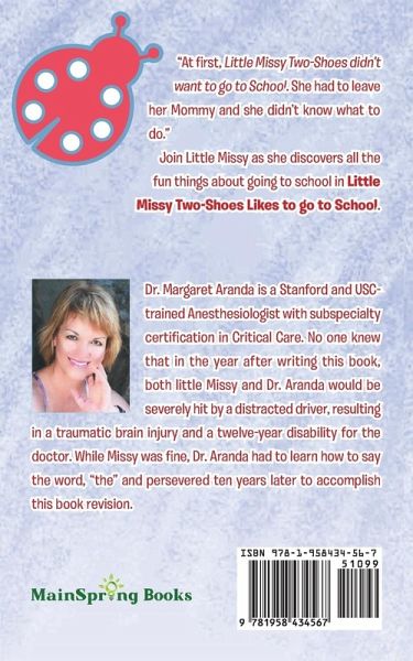 Dr. Margaret Aranda is a Stanford and USC-trained Anesthesiologist with subspecialty certification in Critical Care. No one knew that in the year after writing this book, both little Missy and Dr. Aranda would be severely hit by a distracted driver, resulting in a traumatic brain injury and a twelve-year disability for the doctor. While Missy was fine, Dr. Aranda had to learn how to say the word, "the" and the persevered ten years later to accomplish this book revision.