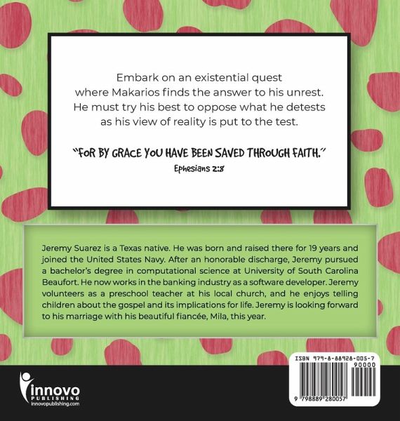 -ABOUT THE BOOK: Embark on an existential quest where Makarios finds the answer to his unrest. He must try his best to oppose what he detests as his view of reality is put to the test. "For by grace you have been saved through faith." -Ephesians 2:8 -ABOUT THE AUTHOR: Jeremy Suarez is a Texas native. He was born and raised there for 19 years and joined the United States Navy. After an honorable discharge, Jeremy pursued a bachelor's degree in computational science at University of South Carolina Beaufort. He now works in the banking industry as a software developer. Jeremy volunteers as a preschool teacher at his local church, and he enjoys telling children about the gospel and its implications for life. Jeremy is looking forward to his marriage with his beautiful fiancée, Mila, this year. -ABOUT THE PUBLISHER: Innovo Publishing LLC is a Christian publisher located near Memphis, TN. Since 2008, Innovo has been publishing quality books, eBooks, audiobooks, music, screenplays, film, and online and physical curricula that support the Great Commission, equip believers, and help create a positive Christian worldview. Innovo's capabilities and global reach provide Christian authors, artists, and ministries access to the world for Christ. To learn more about Innovo Publishing, visit our website at innovopublishing.com. To connect with other Christian Creatives and to learn best practices for creating, publishing, marketing, and selling Christian titles, visit the Christian Publishing Portal at cpportal.com.