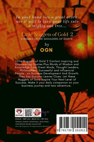 Little Nuggets of Gold 2 contain inspiring and empowering quotes plus words of wisdom and knowledge from great minds, thought leaders, philosophers, successful and influential people...on business development and growth. They say success leaves clues, and if you want to go somewhere, let the people who have already been there many times lead you.Let these nuggets of gold inspire you to your next level of success. Make it your daily companion on your business journey and new adventure.