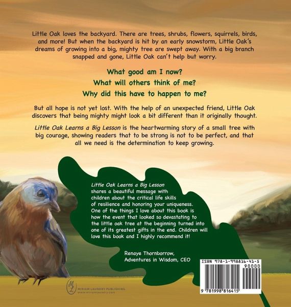 Little Oak loves the backyard. There are trees, shrubs, flowers, squirrels, birds, and more! But when the backyard is hit by an early snowstorm, Little Oak's dreams of growing into a big, mighty tree are swept away. With a big branch snapped and gone, Little Oak can't help but worry. What good am I now? What will others think of me? Why did this have to happen to me? But all hope is not yet lost. With the help of an unexpected friend, Little Oak discovers that being mighty might look a bit different than it originally thought. Little Oak Learns a Big Lesson is the heartwarming story of a small tree with big courage, showing readers that to be strong is not to be perfect, and that all we need is the determination to keep growing.
