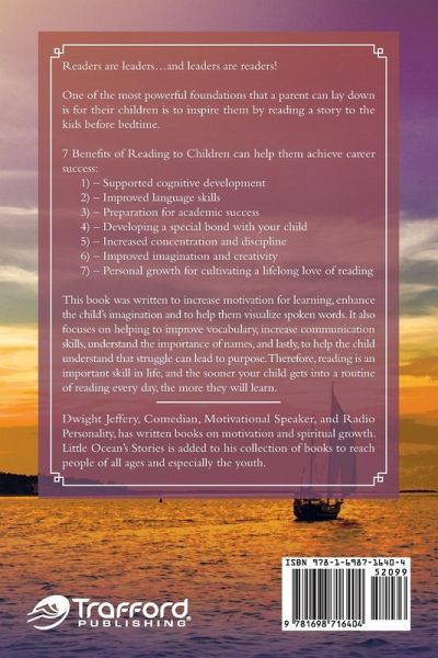 Readers are leaders...and leaders are readers! One of the most powerful foundations that a parent can lay down is for their children is to inspire them by reading a story to the kids before bedtime. 7 Benefits of Reading to Children can help them achieve career success: 1) - Supported cognitive development 2) - Improved language skills 3) - Preparation for academic success 4) - Developing a special bond with your child 5) - Increased concentration and discipline 6) - Improved imagination and creativity 7) - Personal growth for cultivating a lifelong love of reading This book was written to increase motivation for learning, enhance the child's imagination and to help them visualize spoken words. It also focuses on helping to improve vocabulary, increase communication skills, understand the importance of names, and lastly, to help the child understand that struggle can lead to purpose. Therefore, reading is an important skill in life, and the sooner your child gets into a routine of reading every day, the more they will learn.