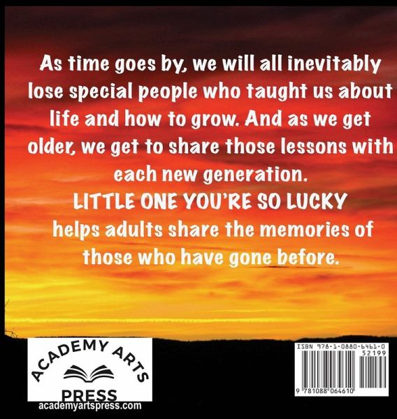 As time goes by, we will all inevitably lose special people who taught us about life and how to grow. And as we get older, we get to share those lessons with each new generation. LITTLE ONE YOURE SO LUCKY helps adults share the memories of those who have gone before to the children in their lives. Dedicated to Blanche and Bob Hardison.