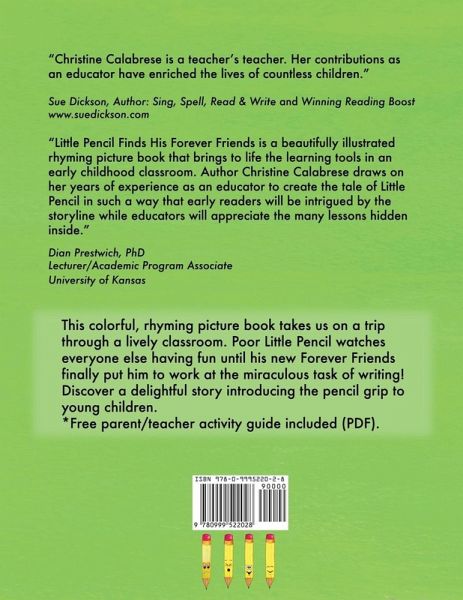 Watching his companions enjoying fun activities, this lovable character becomes increasingly unhappy with his predicament–Little Pencil realizes that he really wants to be helpful but can’t seem to find anything to do! Finally rescued by this new Forever Friends, Little Pencil discovers how useful and important he really is. Creative and colorful artwork enhance this unique, one-of-a-kind rhyming picture book, drawing the reader into a lively classroom. Best of all, the book offers an age-appropriate reference guide for teaching pencil grip (pencil grasp), making writing more fluid and easier for children. Designed to entertain little ones while learning how to hold a pencil, Little Pencil Finds His Forever Friends is essential for every teacher, parent and child, including toddlers, preschoolers, kindergarteners and first graders. Also recommended for homeschoolers, occupational therapists, early childhood classroom teachers (infant grades in UK/AU/NZ), children’s libraries and bookstores, and toy stores. *Free parent/teacher activity guide included (PDF).